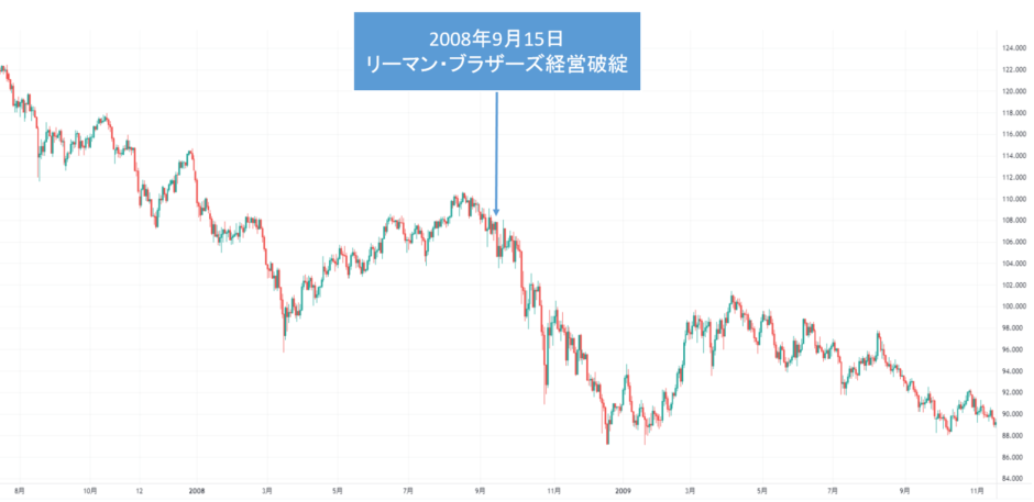 もちろん、これらの値動き全てがリーマンブラザーズの経営破綻によるものというわけではありませんが、あくまで一つの参考程度に見て頂ければと思います。